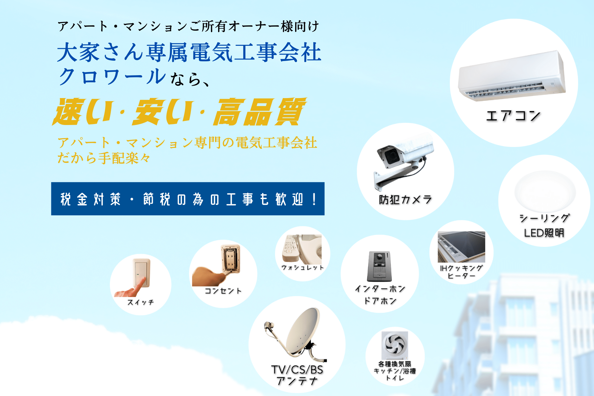 今日ではアパート・マンション専門の電気工事会社として確かな品質をお約束しています。